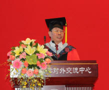 胡永云教授作为教师代表作了发言。他深情回忆了自己的大学生活,并寄语2013届全体毕业生,“永不放弃进步与追求”,并借此向他们表达了自己最真挚的祝愿,祝愿他们在今后的道路上且歌且行,迎接金色秋天里的丰收。
