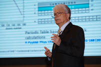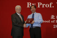 俄罗斯科学院院士、超重元素合成先驱者、国际著名物理学家Yuri Oganessian教授应邀做了题为“原子核质量极限——超重元素合成”的学术报告。北京大学物理学院副院长龚旗煌教授、刘玉鑫教授,技术物理系主任许甫荣教授等在报告会前亲切会见了Oganessian教授,龚旗煌副院长并在报告前为他颁发了“北京大学百年物理讲坛”的纪念品。报告会由原北京大学物理学院院长、现北京大学核物理与核技术国家重点实验室主任叶沿林教授主持。北京大学物理学院师生与来自北大其它院系、清华大学、南京大学、兰州大学、中国科学院理论物理所和近代物理所等单位的近200名师生在现场聆听了Oganessian教授的精彩报告和持续一个半小时的提问和热烈讨论。
