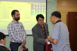 | 朱守华教授介绍学院情况 | 双方互赠纪念品 | 肖立新教授与代表团座谈交流 |