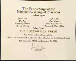 获奖的PNAS论文是由北京大学和清华大学领衔的一项国际合作研究,主要探讨国际贸易对全球大气污染传输的影响(http://pkunews.pku.edu.cn/xxfz/2014-01/20/content_281095.htm)。林金泰研究员和物理学院本科生潘达为共同第一作者,林金泰及清华大学贺克斌和张强教授为共同通信作者。论文于2014年1月份发表之后,被人民日报、环球时报、纽约时报等国内外数十家媒体广泛报导,并得到了学界的广泛关注,迄今论文下载量超过12万次。今年4月26日,林金泰和潘达(现在普林斯顿大学攻读博士学位)应邀参加PNAS及美国科学院(NAS)年会并接受颁奖。