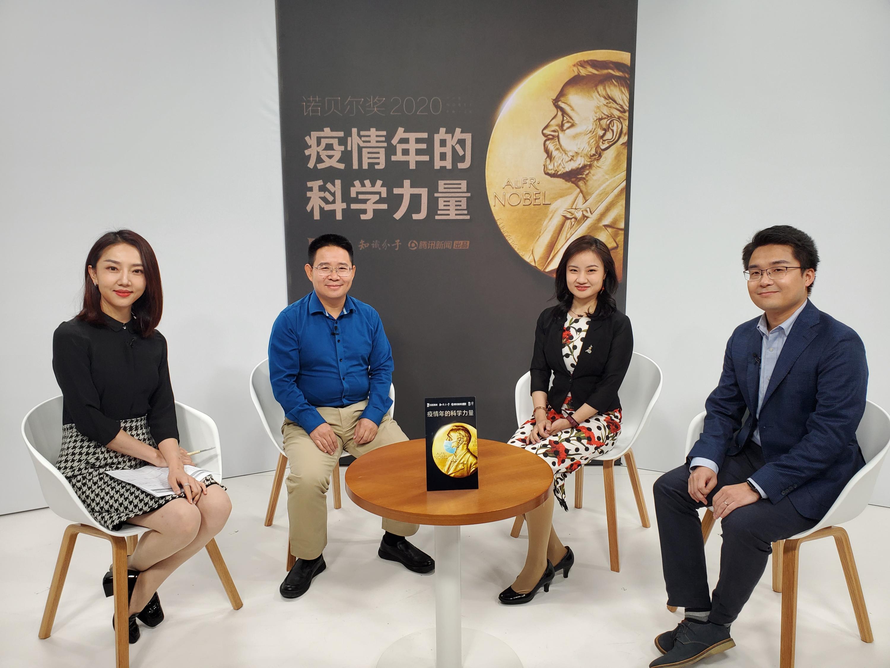 2020年10月6日,本年度诺贝尔物理学奖揭晓。北京大学物理学院副院长彭良友教授(下图左二)应邀做客“疫情年的科学力量”诺贝尔奖特别报道直播节目。该科普活动由微信公众号“知识分子” 与腾讯新闻发起,联合看看新闻、墨子沙龙出品。北京时间17:00起,彭良友与主持人张天娇、物理学院校友中国工程物理研究院储祥蔷研究员、中国科学技术大学徐飞虎教授一道,就诺奖的120年历史、提名和评选过程,近年来令人关注和获奖的研究领域,诺奖及当代社会和人类生命健康等相关话题,与网友展开近90分钟的热烈互动。据悉,当晚直播吸引了21.8万人次在线观看,回放功能将有助于此项科普服务的延续。