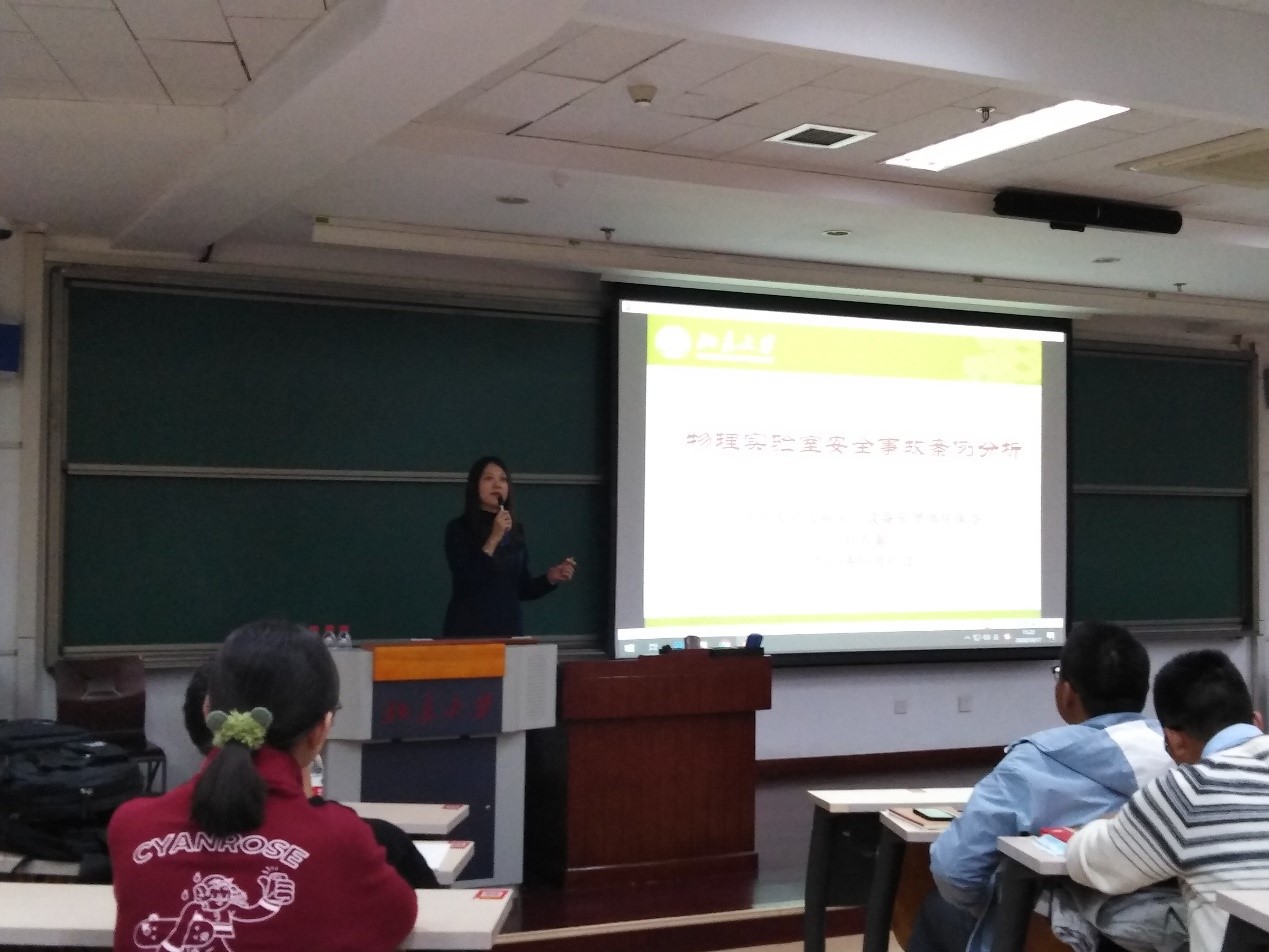 针对物理学院实验课程、环节多的特点,刘雪蕾老师就实验室安全事故案例,生动地说明了实验室安全的重要性,希望引起大家对安全的重视。刘老师播放了近年实验室安全事故的新闻视频,使同学们有了直观的感受。接着,刘老师讲解了大型仪器使用和实验的相关安全注意事项,介绍了事故的紧急处理方法。详实的数据、典型的案例、精准的分析,赢得了现场听众的阵阵掌声。讲座尾声,就实验室安全知识进行了随堂测验。同学们认真作答试卷,表示收获颇丰,会严格遵守实验室的各项制度,时刻注意实验室安全。