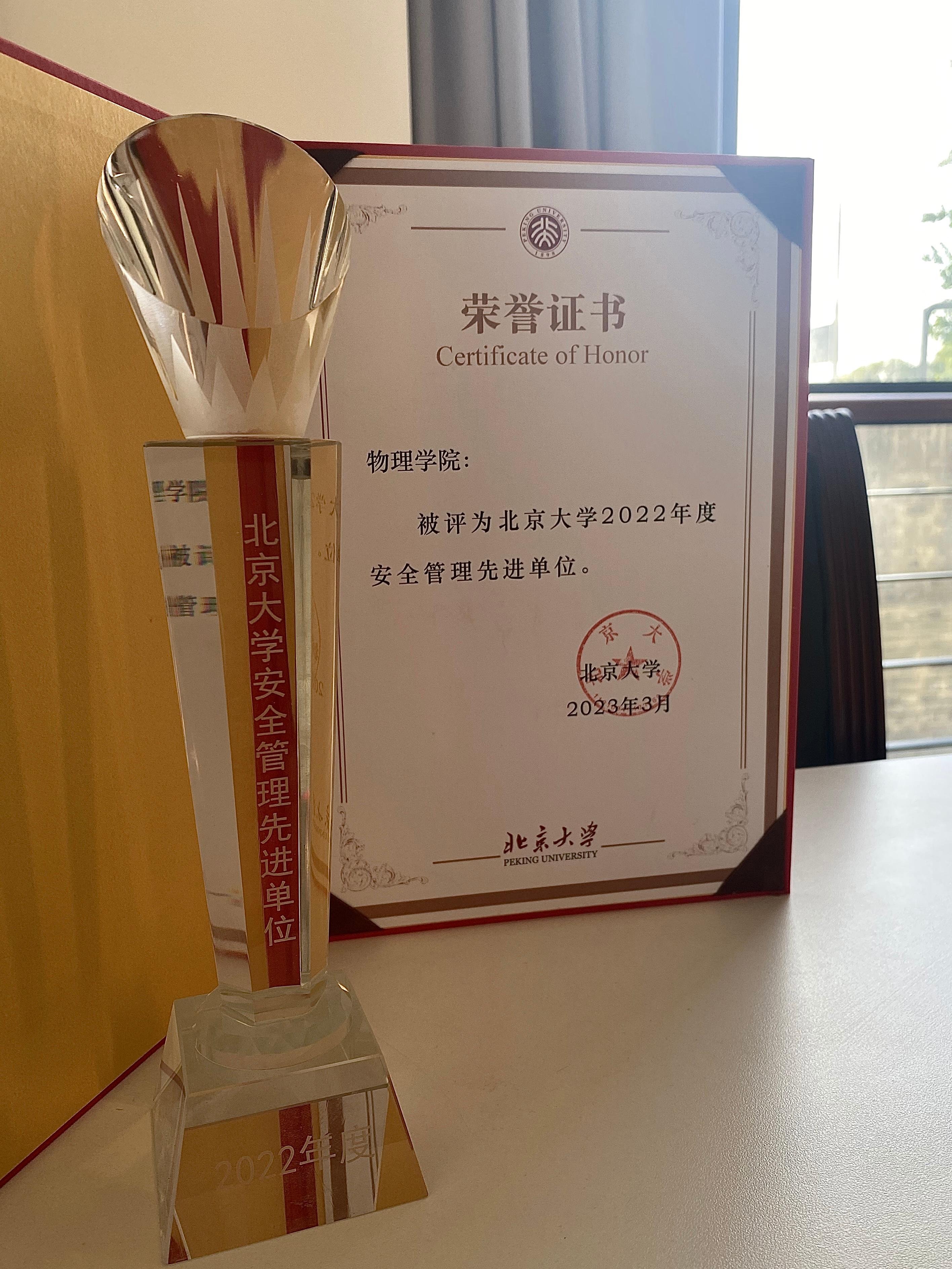 北京大学物理学院2022年度安全管理先进单位奖状和奖杯