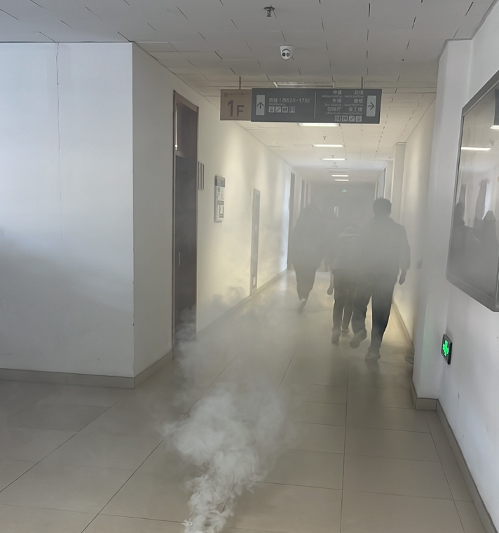 物理大楼、加速器楼、技术物理楼内均精心设置了模拟起火点、疏散通道、紧急集合点等关键区域。其中物理大楼消防疏散演习在11月9日上午10时开始。物理大楼在多处模拟着火点点烟,消防中控室值守人员接到报警后,立即启动消防应急预案。楼内警报随后响起,消防广播开始连续播报,各安全员立即到达指定位置,指引大家有序、快速撤离。师生们用湿毛巾掩住口鼻,俯身前行,迅速而有序地按照疏散路线撤离至楼外安全点。