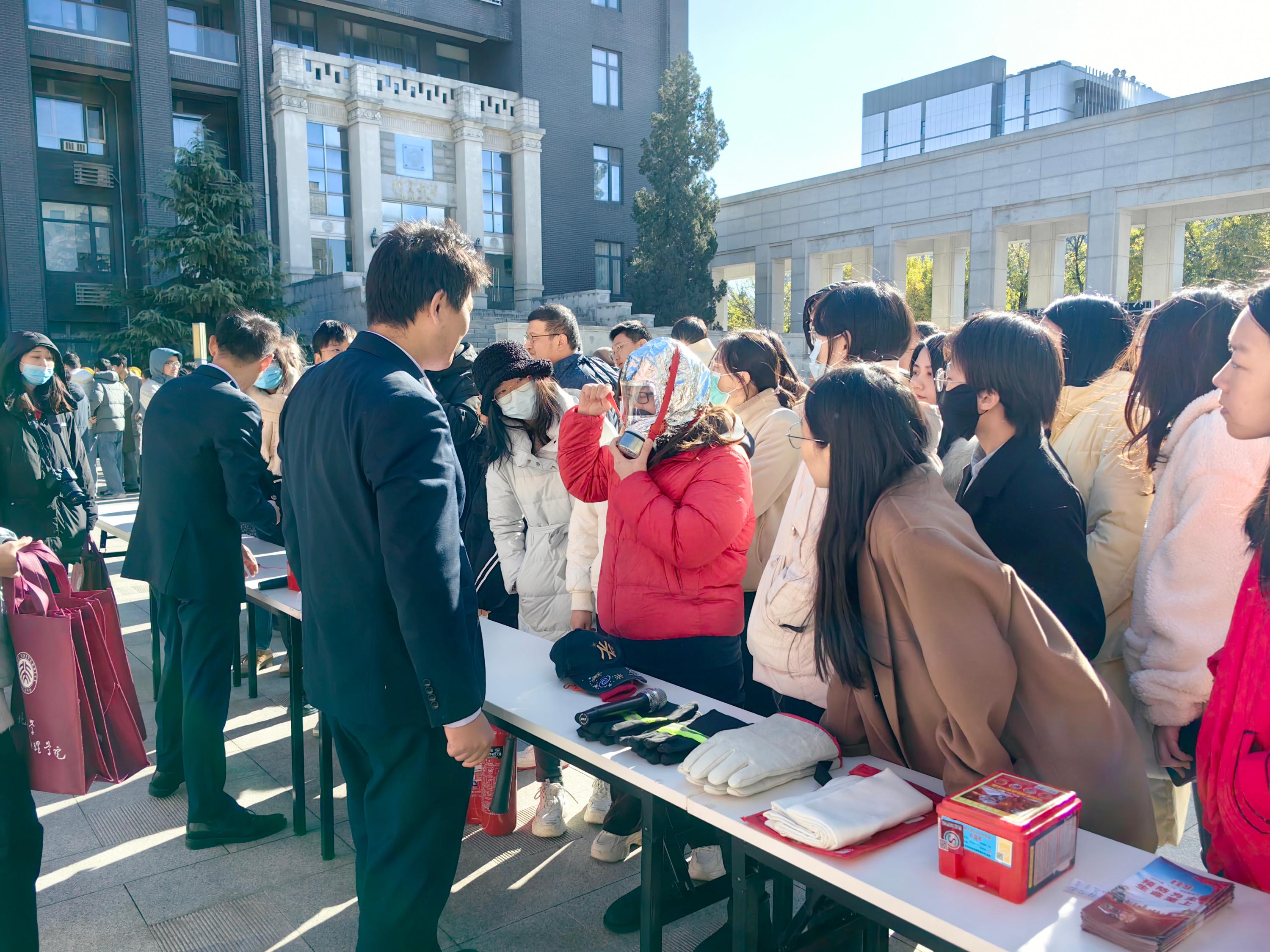 待集合完毕后,物业中控员分别在物理大楼南广场、加速器楼院内东南角空地、技术物理楼主楼一层大厅为师生进行消防知识宣讲和火灾模拟扑救演练。在认真听讲及观摩后,师生亲自体验了使用灭火器现场灭火的过程。现场参与人员还获得了安全锤、求生口哨、救护手册、消防宣传页等消防纪念品。