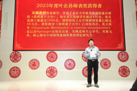 胡永云表示育人不仅仅体现在课堂,更体现在对学生的关爱和言传身教。作为一名教育工作者,他将继续践行教书育人使命,用学术热情和科学素养感染每一位同学,为国家和北大物院培养更多拔尖创新人才。