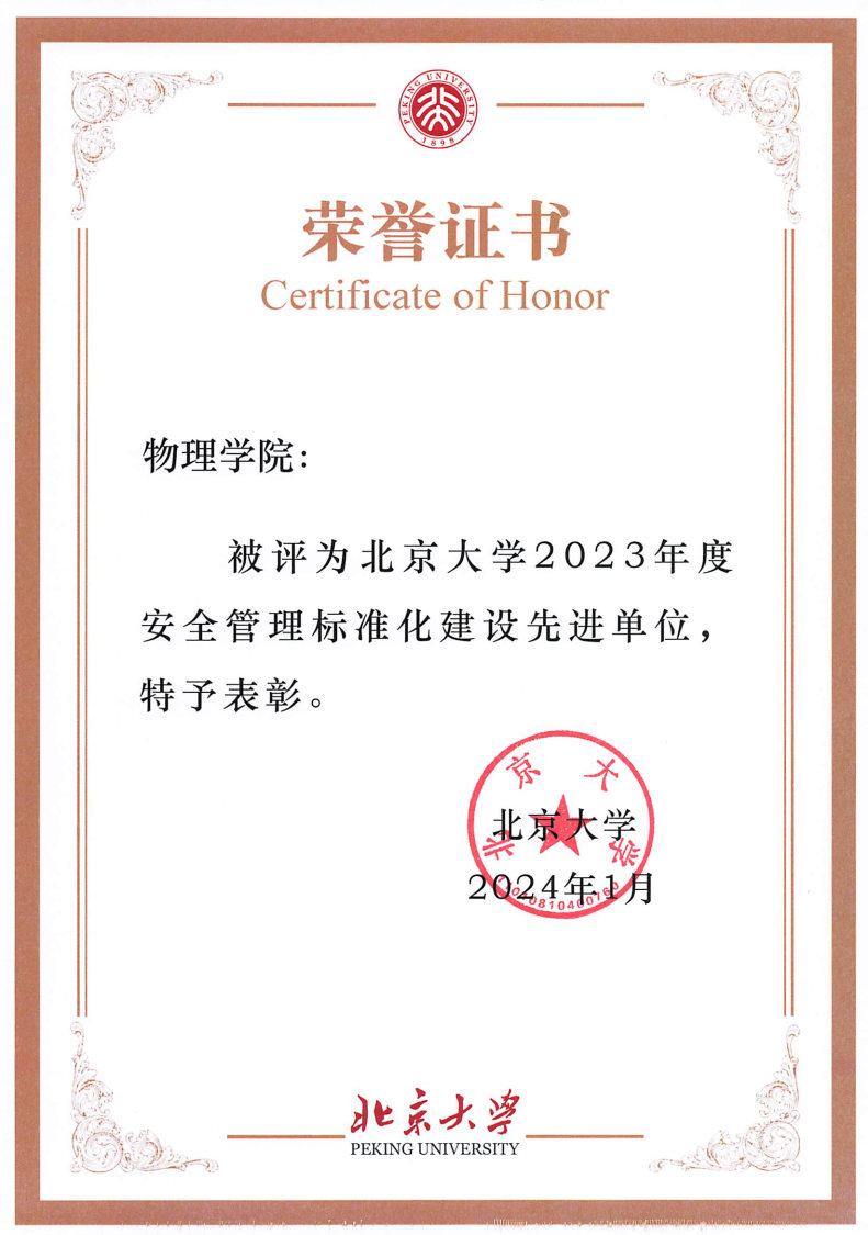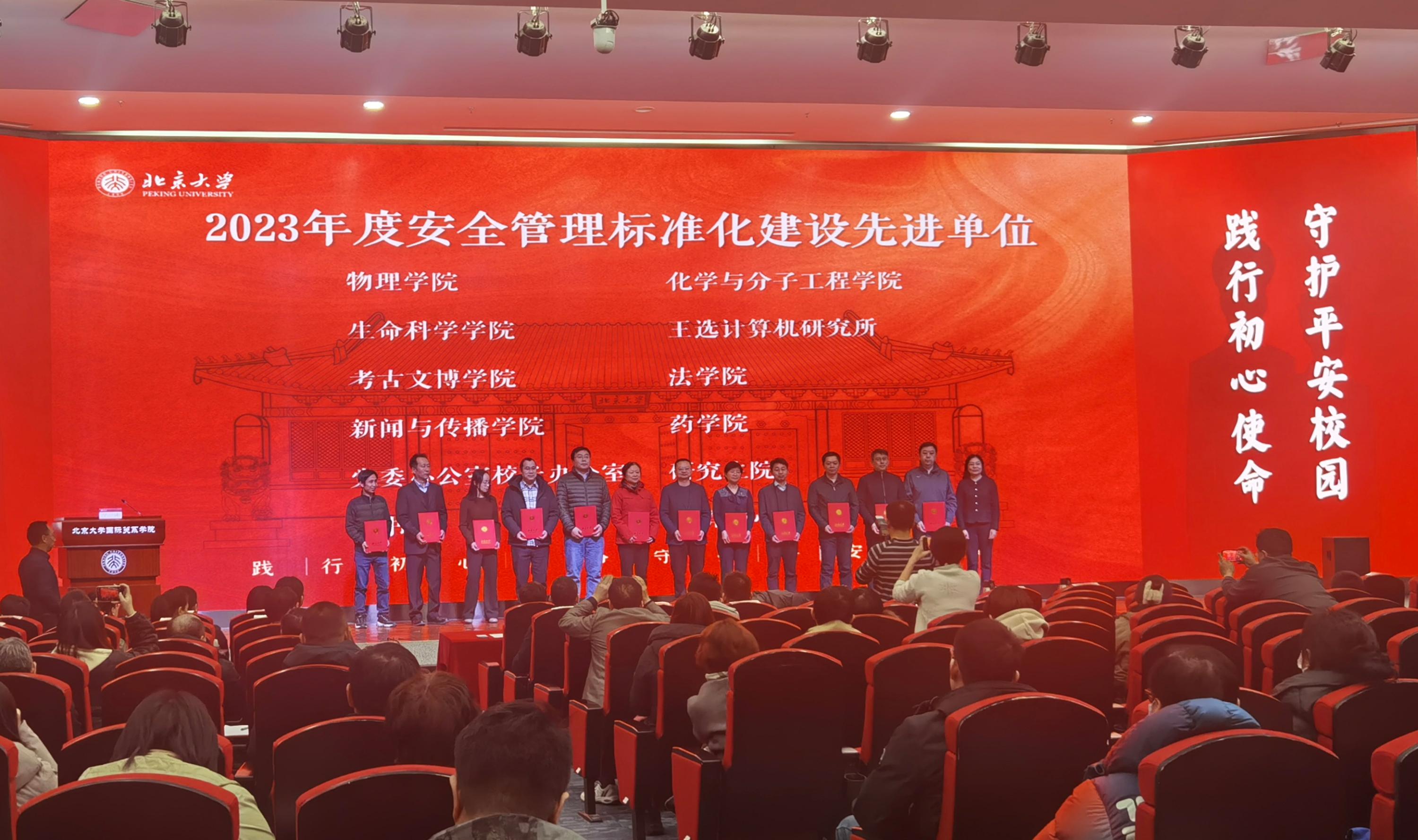 2024年3月1日下午,北京大学2024年春季学期安全业务工作会议召开。在学校安全管理检查评比中,物理学院被评为北京大学2023年度安全管理标准化建设先进单位。这是物理学院继2021年度、2022年度获评北京大学安全管理先进单位后进一步获奖。4位物理学院老师商庆军、周路群、李晓敏和胡克倩被评为北京大学2023年度安全管理先进个人。