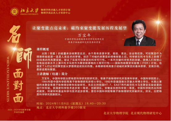 2024年11月8日晚,由北京大学物理学院、北京现代物理研究中心主办的“北京大学物理学科卓越人才培养计划讲堂:名师面对面”(第三十一期)在北京大学理科教学楼203教室举行。中国科学院合肥物质科学研究院研究员、等离子体物理研究所首席科学家万宝年院士应邀讲授“让聚变能点亮未来:磁约束聚变能发展历程及展望”。本期讲堂由北京大学物理学院院长、北京现代物理研究中心副主任高原宁院士主持。