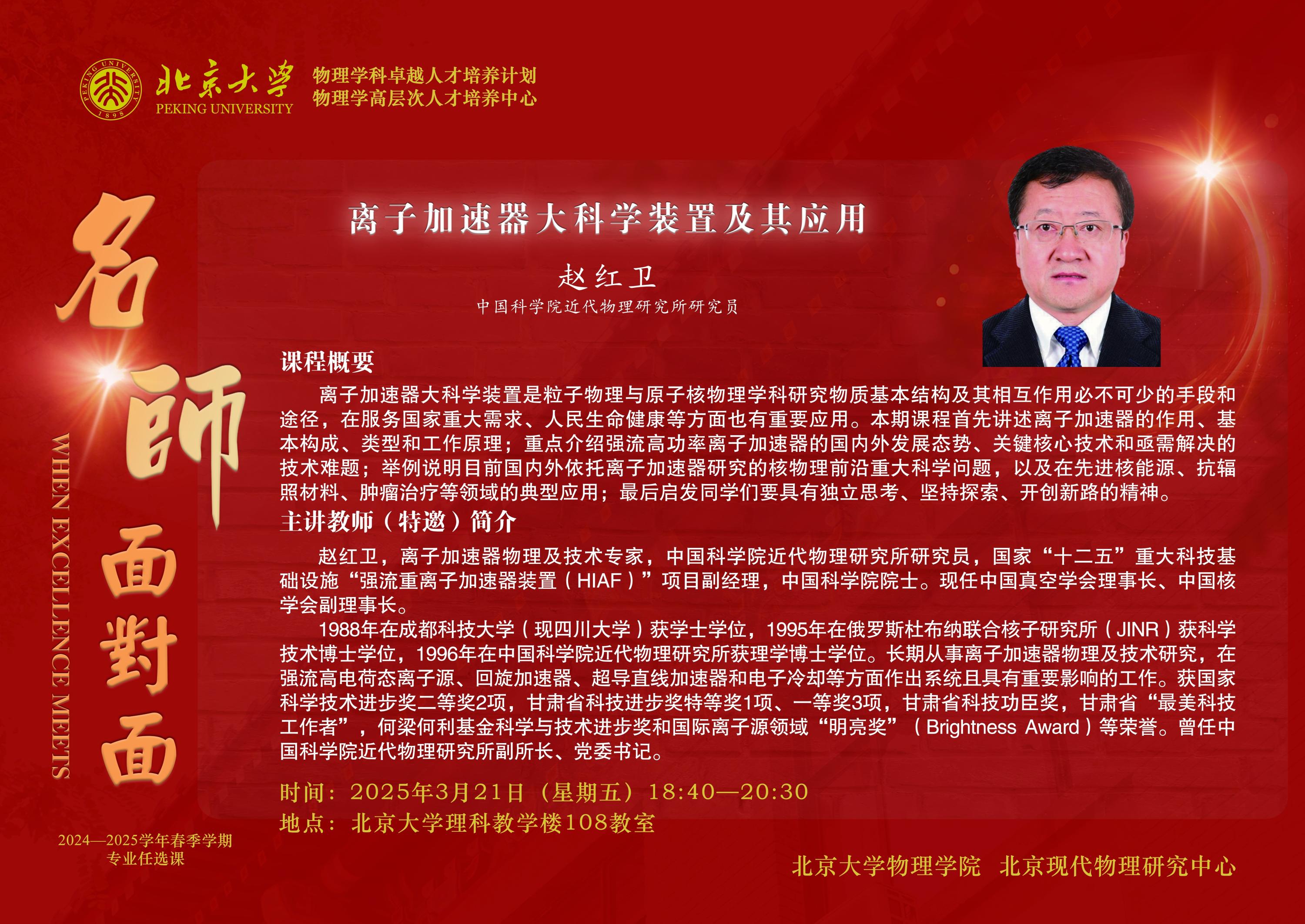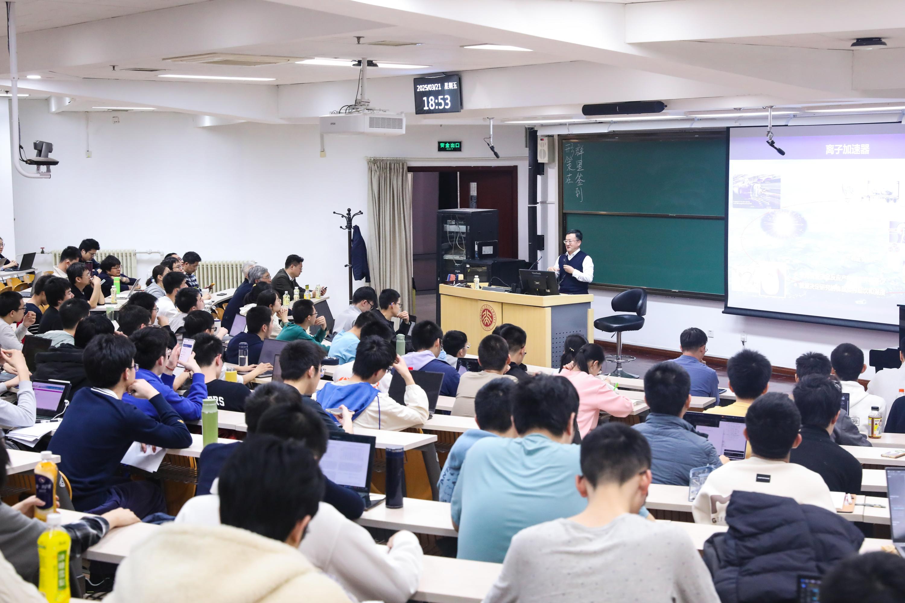 2025年3月21日晚,由北京大学物理学院、北京现代物理研究中心主办的“北京大学物理学科卓越人才培养计划讲堂:名师面对面”(第三十七期)在北京大学理科教学楼108教室举行。中国科学院近代物理研究所研究员、中国真空学会理事长赵红卫院士应邀讲授“离子加速器大科学装置及其应用”。本期讲堂由北京大学物理学院院长、北京现代物理研究中心主任高原宁院士主持。