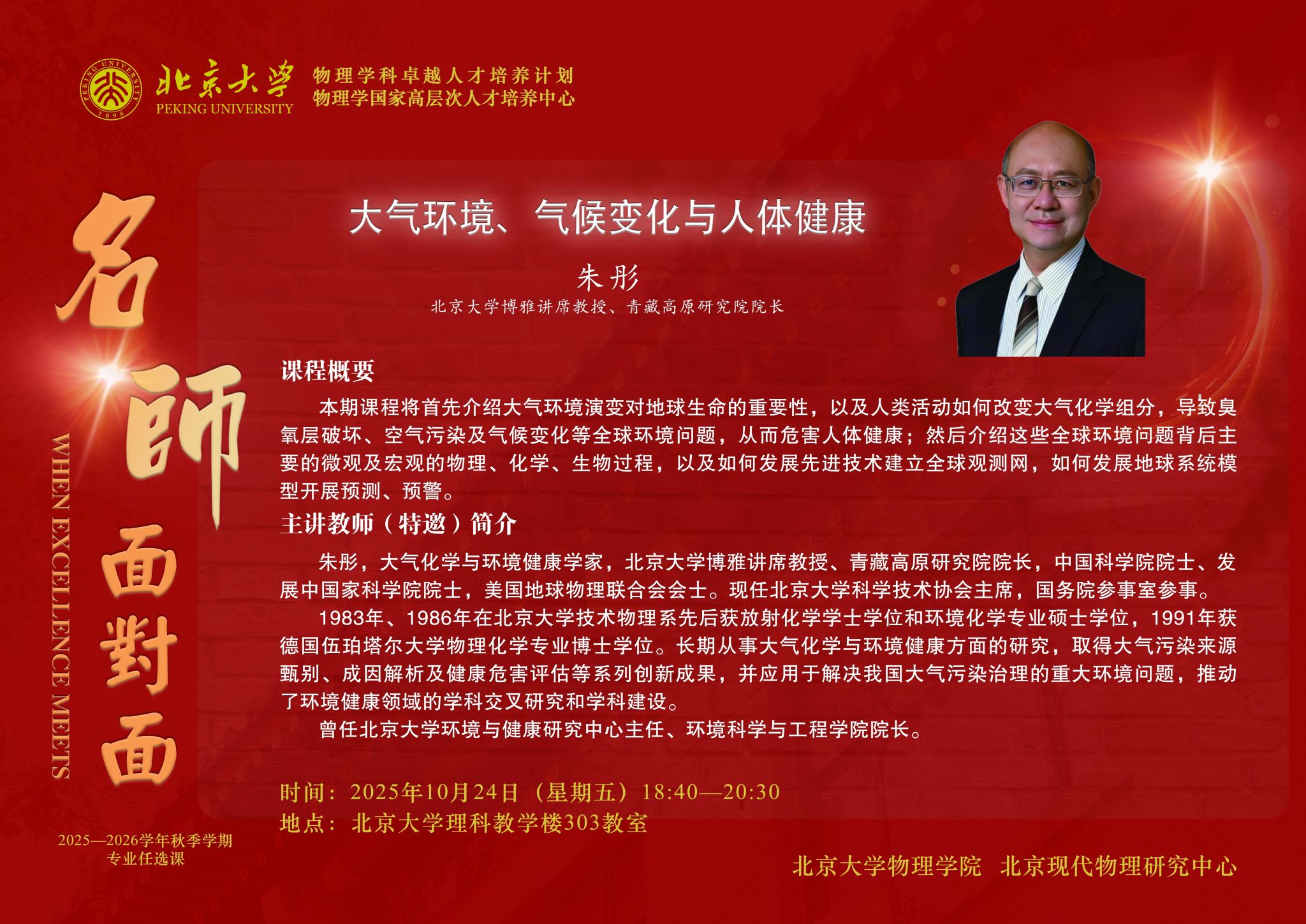 2025年10月24日晚,由北京大学物理学院、北京现代物理研究中心主办的“北京大学物理学科卓越人才培养计划讲堂:名师面对面”(第四十四期)在北京大学理科教学楼303教室举行。北京大学博雅讲席教授、青藏高原研究院院长、科学技术协会主席朱彤院士应邀讲授“大气环境、气候变化与人体健康”。本期讲堂由北京大学博雅讲席教授、北京现代物理研究中心主任高原宁院士主持。