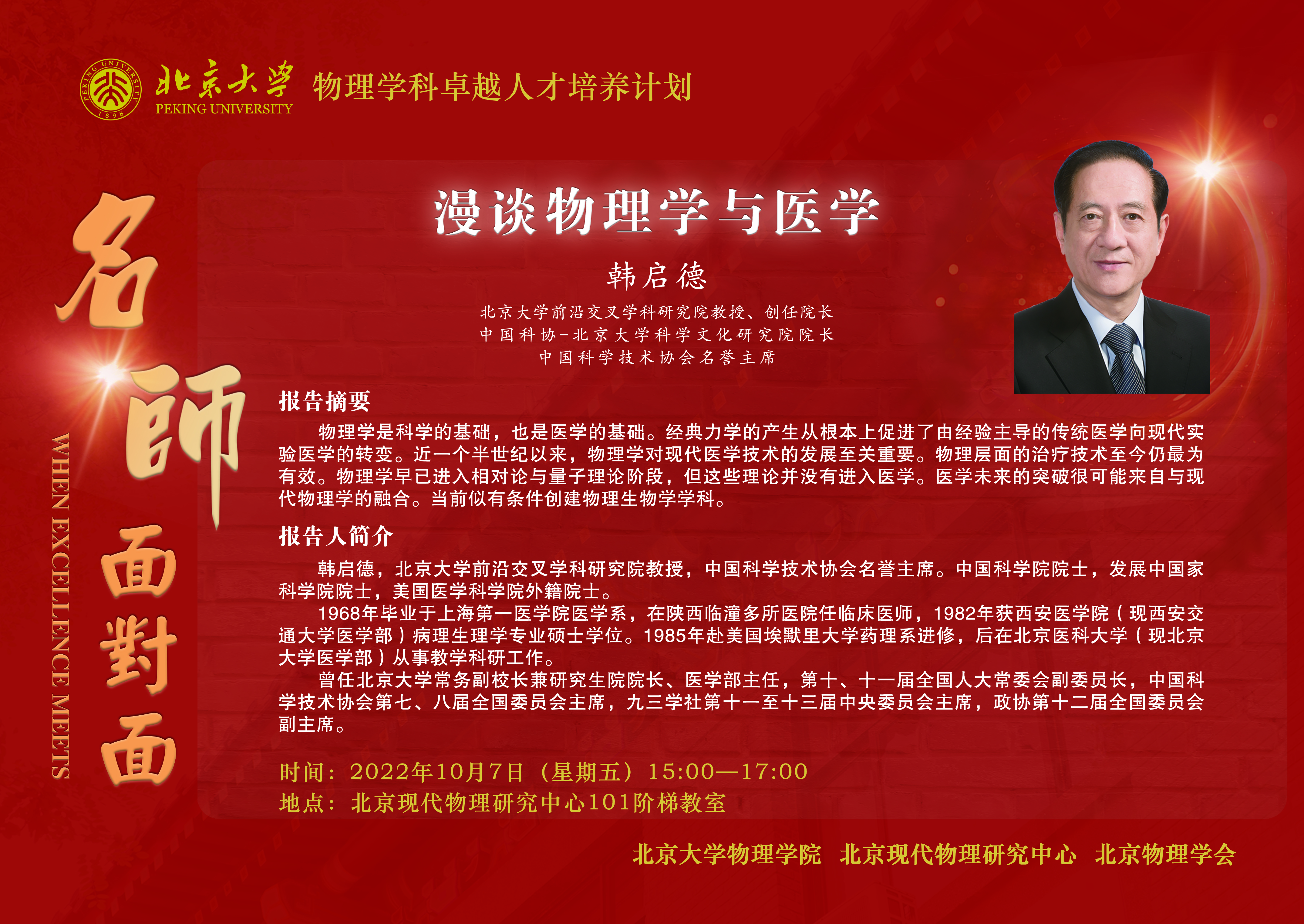 2022年10月7日下午,由北京现代物理研究中心、北京大学物理学院、北京物理学会主办的北京大学物理学科卓越人才培养计划“名师面对面”第二场活动在北京大学老化学楼东配楼101教室举行。北京大学前沿交叉学科研究院教授,中国科学技术协会名誉主席韩启德院士应邀作了题为“漫谈物理学与医学”的报告。本场活动由北京大学物理学院院长、北京现代物理研究中心副主任高原宁院士主持。