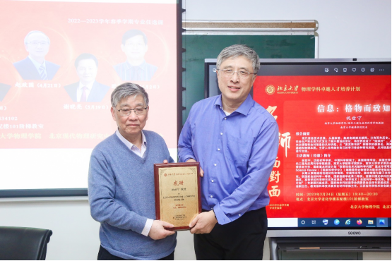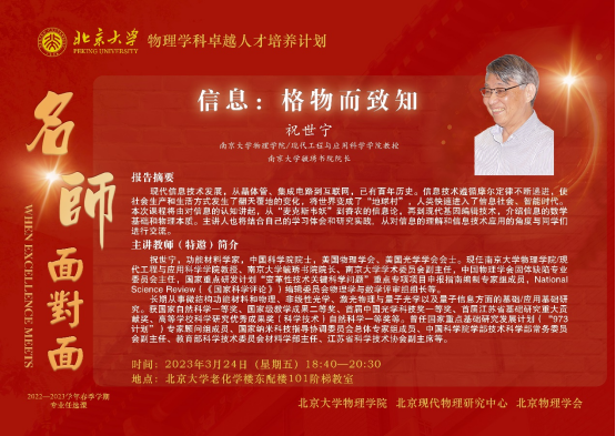 2023年3月24日晚,由北京现代物理研究中心、北京大学物理学院、北京物理学会主办的“北京大学物理学科卓越人才培养计划讲堂:名师面对面”(第八期)在北京大学老化学楼东配楼101教室举行。南京大学物理学院/现代工程与应用科学学院教授、南京大学毓琇书院院长祝世宁院士应邀作了题为“信息:格物而致知”的报告。本期讲堂由北京大学物理学院院长、北京现代物理研究中心副主任高原宁院士主持。