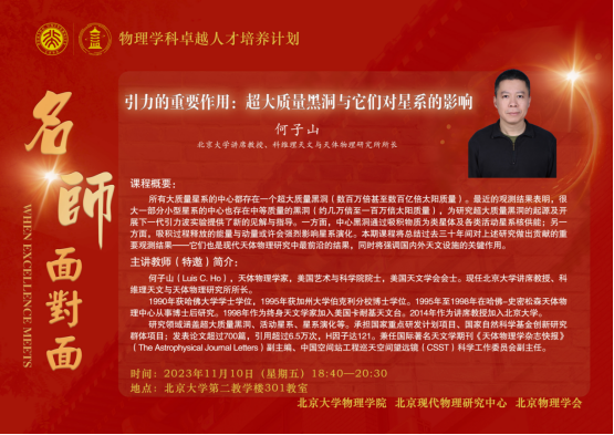 2023年11月10日晚,由北京大学物理学院、北京现代物理研究中心、北京物理学会主办的“北京大学物理学科卓越人才培养计划讲堂:名师面对面”(第十六期)在北京大学第二教学楼301教室举行。北京大学讲席教授、科维理天文与天体物理研究所所长,美国艺术与科学院院士何子山应邀讲授“引力的重要作用:超大质量黑洞与它们对星系的影响”(Gravity’s Fatal Attraction: Supermassive Black Holes and their Impact on Galaxies)。本期讲堂由北京大学物理学院院长、北京现代物理研究中心副主任高原宁院士主持。