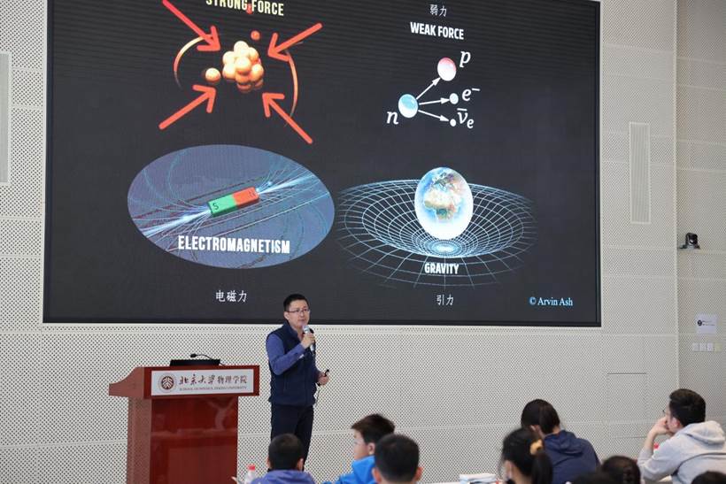 接着,邵老师深入到微观领域,为同学们介绍物质的根本组成——在质子和中子之下,还存在着更低一级的基本粒子:轻子和夸克。他讲解了现代粒子物理中“物理学的元素周期表”标准模型的观点,特别提及了在2012年已经确定发现的“上帝粒子”——希格斯玻色子,为同学们开启了关于物质深层次的科学大门。