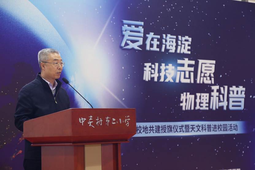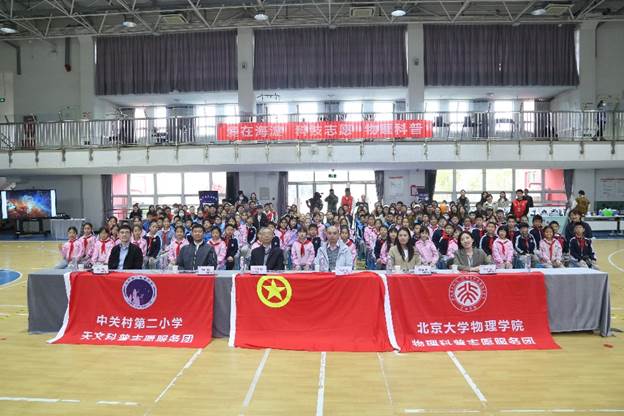 4月22日下午,北京大学物理学院携手中关村第二小学联合开展“爱在海淀 科技志愿 物理科普”校地共建授旗仪式暨科普进校园活动。来自北京大学物理学院、北京大学青年天文学会的40余名志愿者带着妙趣横生的物理实验和神秘美丽的深空摄影展走进小学校园,精彩的科普活动赢得了现场师生的一致好评。中关村第二小学校长倪百明、海淀团区委志愿服务指导中心主任焦孟琳、北京大学物理学院党委副书记穆良柱出席了本次活动。