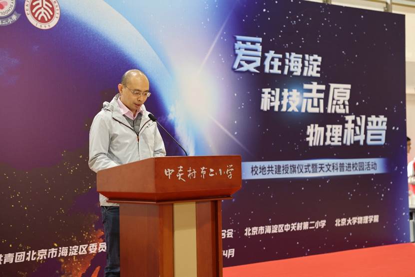 随后,物理学院党委副书记穆良柱教授致辞,他指出,今年将迎来北大物理学科建立110周年,一直以来,物理学院在人才培养上致力于反哺社会大课堂。同学们能够通过科普志愿服务的形式播撒崇尚科学、探索求知的种子,让更多人感受到科学知识的魅力。希望能通过这次活动联动中关村二小的优质教育资源,促进科学教育向社会大众开放共享。