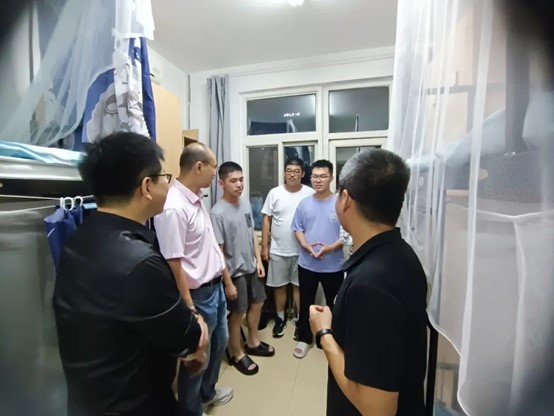 2023年8月19日晚,新生家长会结束后,刘雨龙、曹庆宏、穆良柱、各班班主任、辅导员、吴卓颖一行前往37楼学生宿舍,看望慰问物理学院本科新生。