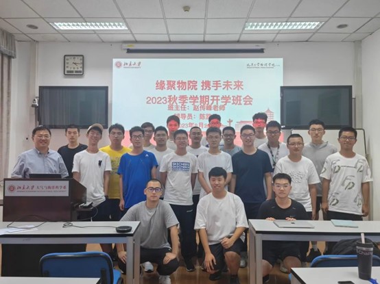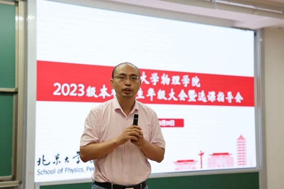 2023年8月20日上午,北京大学物理学院2023级本科新生第一次年级大会在理科教学楼107教室召开,曹庆宏,穆良柱,2023级本科生班主任代表和辅导员代表,综合办公室李晓敏老师,教务办公室丁思远老师,学生工作办公室全体老师,以及2023级物理学院本科生参加会议。会议由吴卓颖主持。