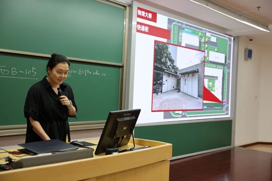 李晓敏老师介绍了物理学院的基础设施,包括物理大楼、加速器楼、技术物理楼等楼宇的地理分布,消防及急救设施情况,可供同学们使用的咖啡厅、会议室、自习室等功能区位置,以及学院各系所秘书办公室信息。