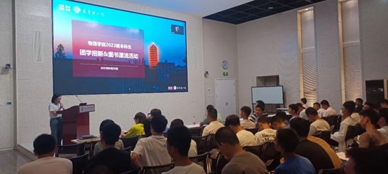 2023年8月20日晚,物理学院团学组织招新及图书漂流活动在物理学院西楼301思源多功能报告厅召开,学生工作办公室范若孜、朱敏、吴卓颖参加本次活动。物理学院学生会主席团成员施梓瀚、吴天可,团委组织部吴俊慷主持活动。物理学院团学各部门负责人为同学们介绍了基本情况,邀请新生积极报名。