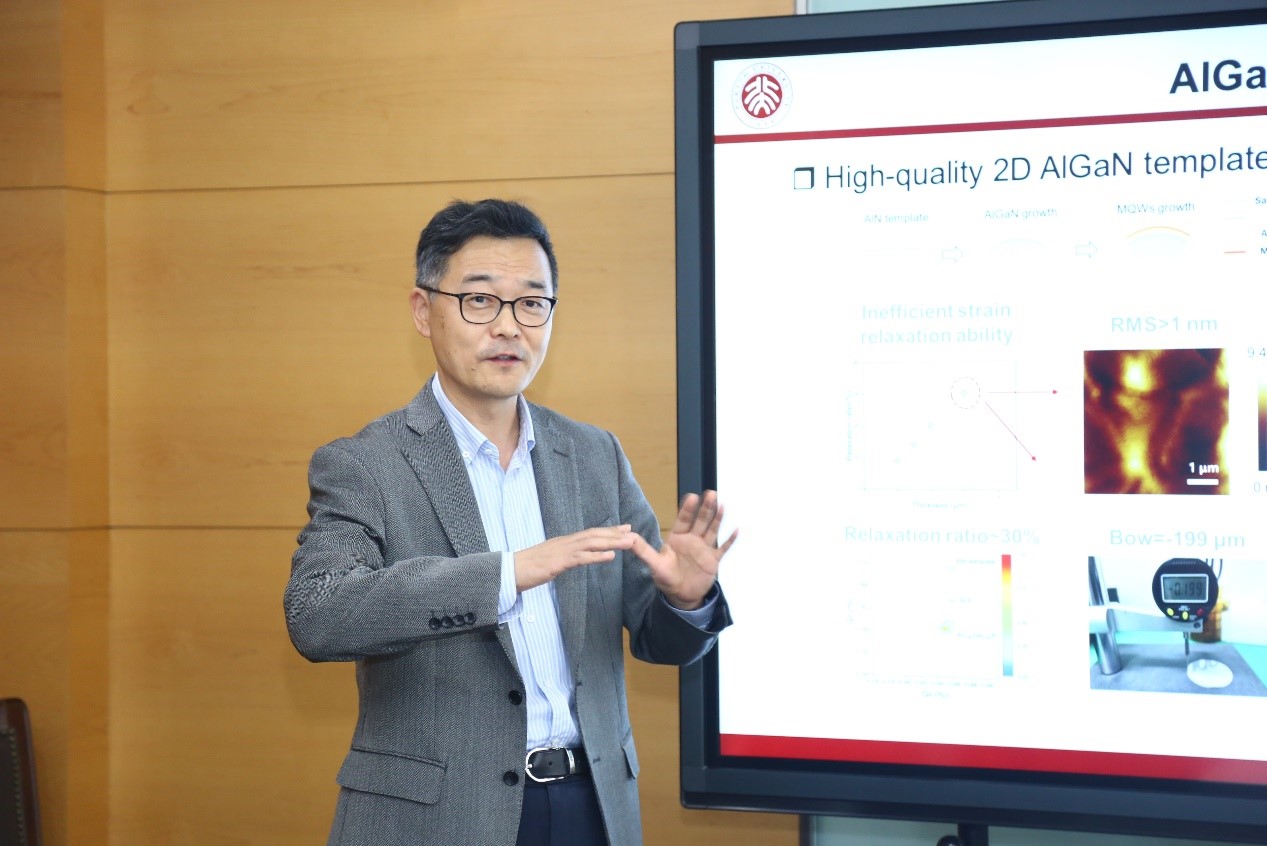 王新强、边珂等物理学院教师代表与来访人员开展了深入座谈交流。王新强首先介绍了北京大学宽禁带半导体研究中心的基本概况,并就三族氮化物量子结构的外延和器件应用方面作了报告,介绍了团队在氮化镓(GaN)基深紫外光源、红光微型发光二极管、高迁移率薄膜、准范德华外延、原子级表征及铁电材料等领域取得的重要进展,及部分成果的产业转化情况。