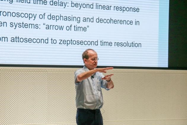 Burgdörfer教授首先提出了一个量子力学中的基本问题:时间是一个参数还是可观测量?随后Burgdörfer教授指出经典物理中的时间概念本身在量子力学中并没有算符对应,可作为观测量的实际上是时间延迟。随后在报告的第一部分,Burgdörfer教授介绍了用于测量阿秒时间延迟的阿秒条纹相机和RABBITT方法。在讲座的第二部分,Burgdörfer教授聚焦于原子分子中电离延时问题,就氢原子和氢分子离子的光电离过程、氖原子与氦原子的阿秒条纹谱、原子核运动对分子电离延时的影响展开了讨论。在讲座的第三部分,Burgdörfer教授介绍了一些关于电离延时的最新进展,包括金属表面的时间分辨光电子谱、基于能带结构的价带光电子发射的电离延时测量方案等。最后,Burgdörfer教授概括了原子分子以及凝聚态物质在强场中的电子动力学过程以及时间分辨谱学的基本特性,并展望了超出线性响应区的非线性强场电离延时、开放系统中的退相干时间测量等科学问题。