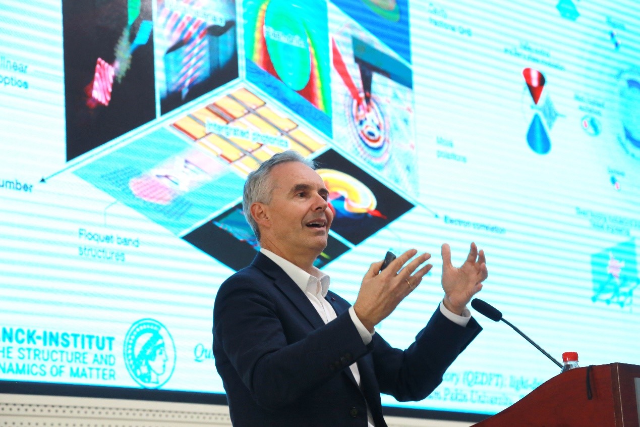 2024年10月21日,北京大学物理学院学术论坛(第四十四讲)在物理学院思源多功能厅成功举办。德国马克斯普朗克结构与动力学研究所所长、德国科学院院士和中国科学院外籍院士Angel Rubio教授应邀作了题为“量子电动力学密度泛函理论——量子材料的光调控”(Quantum Electrodynamics Density functional theory (QEDFT): quantum materials engineering with light)的学术报告。本次论坛由物理学院凝聚态物理与材料物理研究所李新征教授主持。