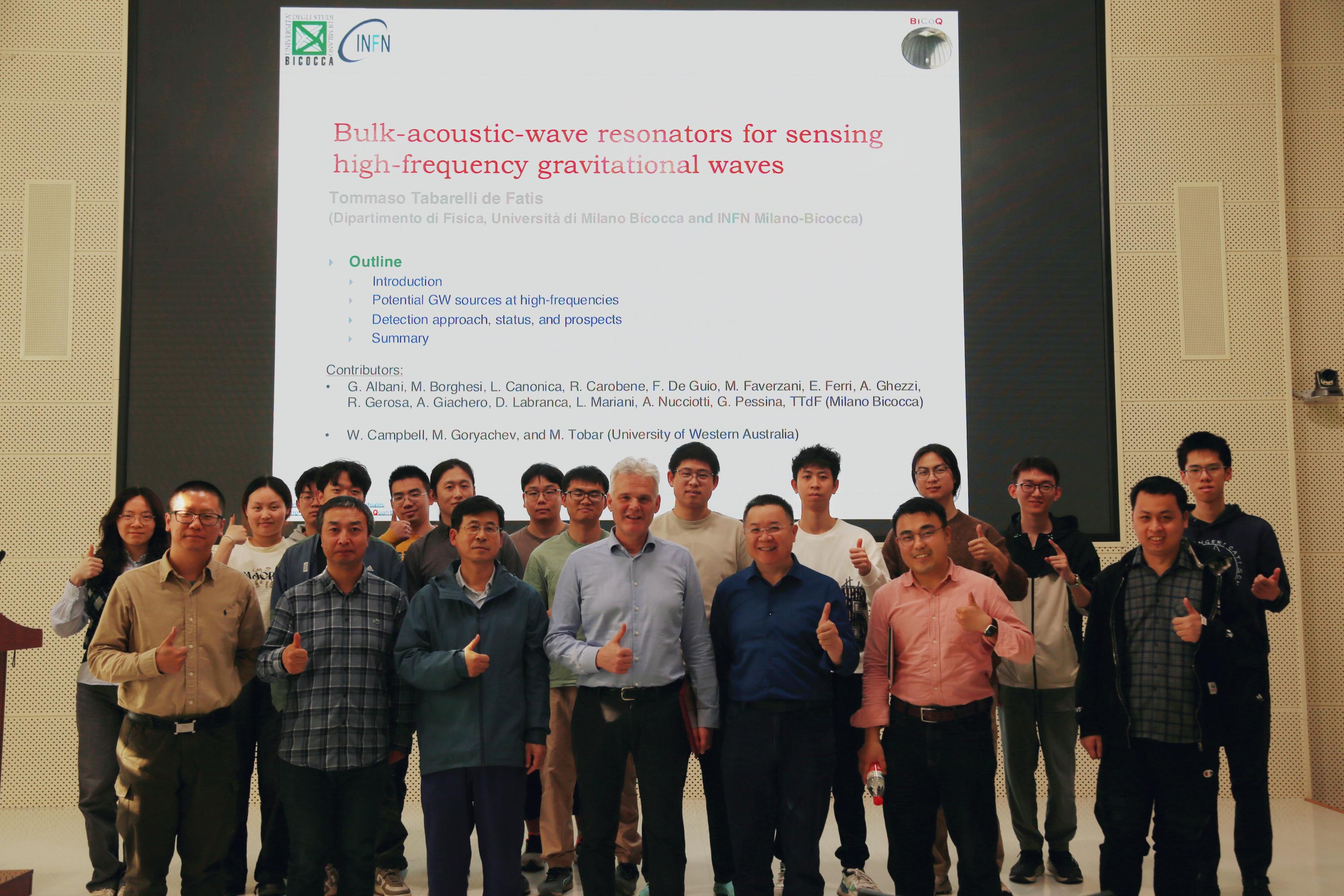引力波从何而来?托马索教授在报告中提到,早期宇宙膨胀、相变等初期事件,和晚期宇宙所发生的双黑洞现象、超新星爆发是引力波的双源头,相关的探测早在2015年就已经在LIGO上进行。人类至今发展了两种主流技术的引力波探测器:通过激光测量引力波引起的空间伸缩研发的干涉仪,刚刚提到的LIGO就属于此类;另一类则是利用共振体检测特定频率的潮汐形变的共振质量探测器。低频引力波已有的测量意味着多探测器协同测量是必要的,而为了探测更高频引力波,新的探测器的开发同样是重中之重。托马索教授领导并参与建设的体声波谐振器(BAW)就是特地为高频引力波探测而开发的新型探测器。