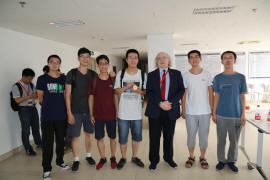 同学们在报告会茶歇时手持诺贝尔奖 奖章与Haldane教授合影留念 |