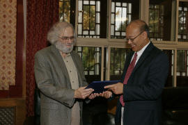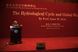 国际著名的气候动力学专家、美国大气海洋管理局地球流体动力学实验室高级研究科学家、普林斯顿大学教授Isaac M. Held博士应邀做了题为“水循环与全球变暖”的学术报告。北京大学副校长、教务长王恩哥教授在报告会前会见了Held教授,并为Held教授颁发了“北京大学客座教授”的荣誉证书。报告会由北京大学物理学院院长助理大气与海洋科学系系主任胡永云教授主持,北京大学物理学院院长谢心澄教授向听众介绍了Held教授,并在报告会后为Held教授颁发了“北京大学百年物理讲坛”的纪念品。北京大学物理学院师生与来自北大其它院系、清华大学、北京师范大学、南京大学,华东师范大学、中国科学院以及中国科学院研究生院等单位的200多名师生在现场聆听了Held教授的精彩报告,并在会后与Held教授进行了学术交流。