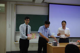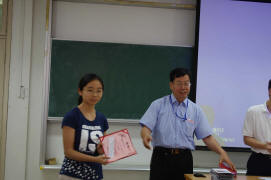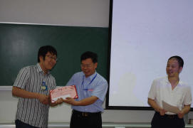 教授评审团认真听取报告并评出一、二、三等奖各2名。在闭幕式上,香港中文大学林海青教授代表评审团宣读了获奖名单,物理学院刘玉鑫副院长为获奖同学颁发了获奖证书和奖金。