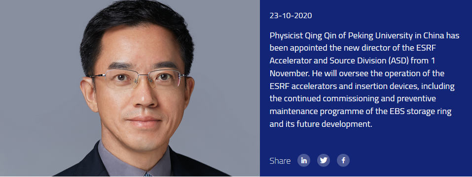 2020年10月23日,欧洲同步辐射装置(The European Synchrotron Radiation Facility, ESRF)官方任命北京大学物理学院“博雅”特聘教授秦庆为加速器及辐射源部门(Accelerator and Source Division, ASD)主任,任期五年(自2020年11月1日起)。作为中国乃至亚洲首位在欧洲大型加速器部门担任高层管理人员的科学家,秦庆将在履职期间负责除光束线站外整个装置的运行、未来升级和发展规划。