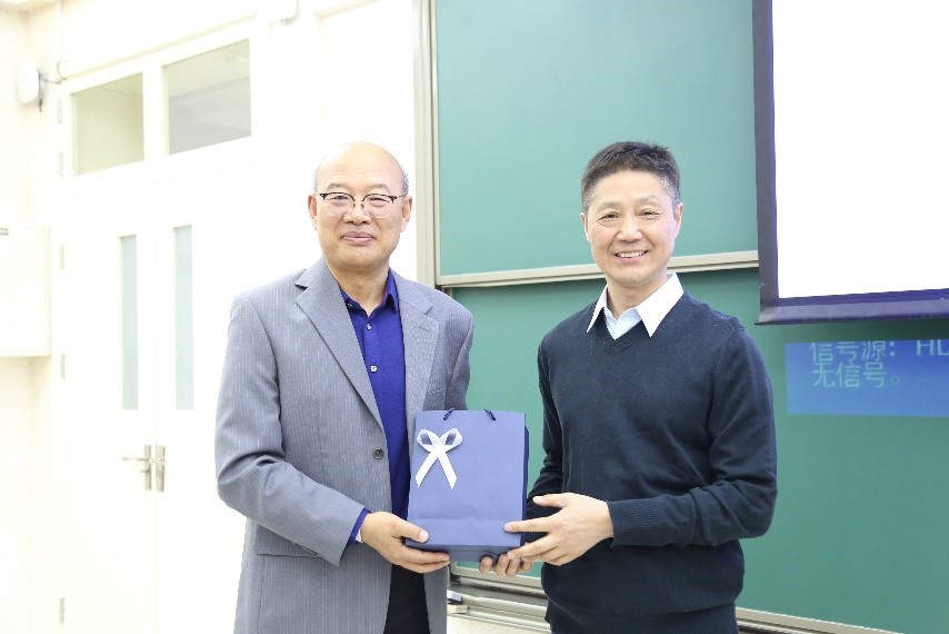 报告结束后,本场主持人胡晓东教授向王恩哥赠送了精美的纪念品,衷心感谢他于2002、2008和2010年三度做客论坛,以实际行动支持论坛发展和关注研究生成长。
