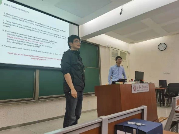 4月22日,在叶堉研究员主持下,北京理工大学王学云副教授应邀作了题为“六角锰氧化物铁电体中的拓扑铁电畴”(Topological ferroelectric domain in hexagonal manganites)的第二场学术报告,涉及拓扑铁电畴形成的机制及其与宇宙学中Kibble-Zurek机制的内在联系,实空间下铁电畴结构形态、分布与演化的规律,多种外物理场调控铁电畴物理性质,以及铁性材料在航空航天、电子信息和能源等领域的广泛应用,引起听众浓厚兴趣。