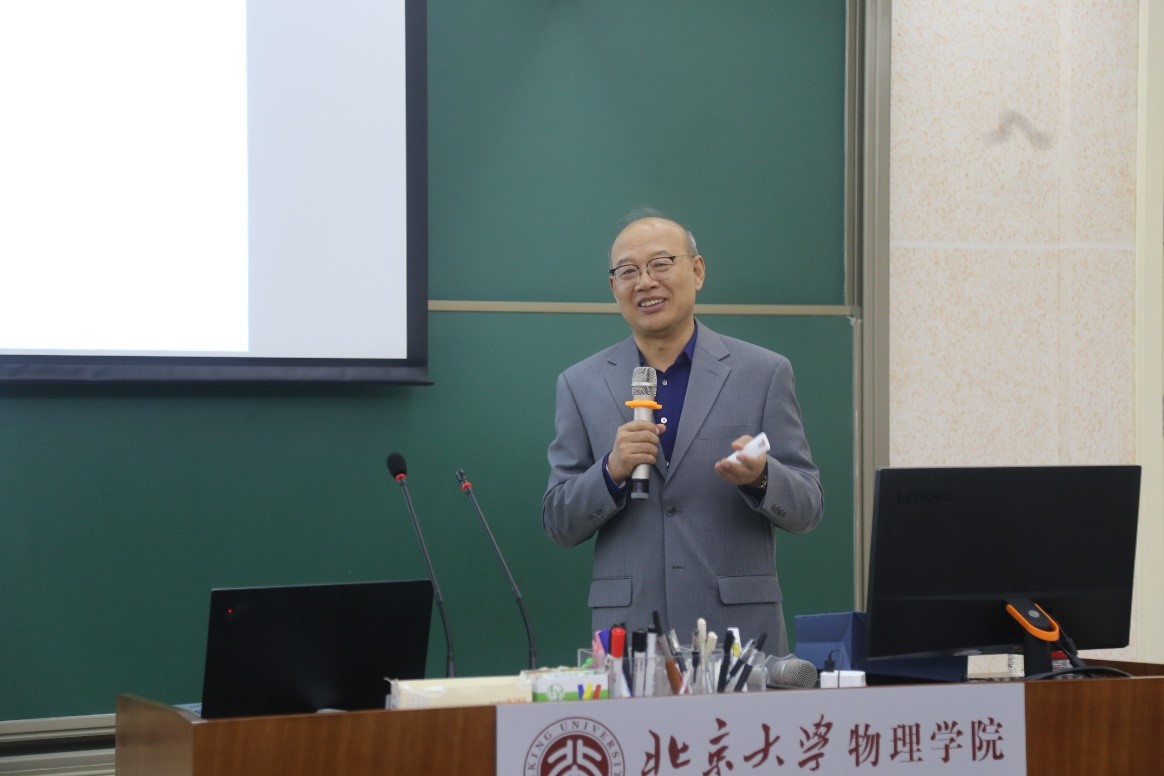 随后,物理学院量子材料科学中心王恩哥院士应邀作了题为“亚分子级研究揭示水的全量子本质”(Full quantum nature of water: a study at sub-molecular level)的第500期首场学术报告。他从量子力学发展历程中对原子核经典处理所导致的问题出发,说明了轻元素体系同时对原子核和电子波函数化的重要性,系统阐述了凝聚态全量子物理学的概念,解读了水分子微观观察、结构确定、水分子和水中氢原子运动规律、冰表层缺陷形成的物理机制等多个方面的研究进展和高水平成果。同时,他回顾了自上世纪80年代在北京大学物理系攻读博士学位至今从事科学研究和指导学生的经历和体会,分享了“把简单的事情做正确”的态度和理念,勉励学生和青年教师一旦认准一个有意义的目标,就要坚持不懈,追求极致,达成学术成就。