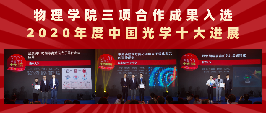 2021年4月25日,首届光学前沿高峰论坛暨2020年度中国光学十大进展颁奖典礼在杭州举行。北京大学物理学院与合作单位的基础研究成果“金属钠:助推等离激元光子器件走向应用”“单层氮化硼声子极化激元的直接观测”和应用研究成果“双倍频程展宽的芯片级光频梳”榜上有名。其中: