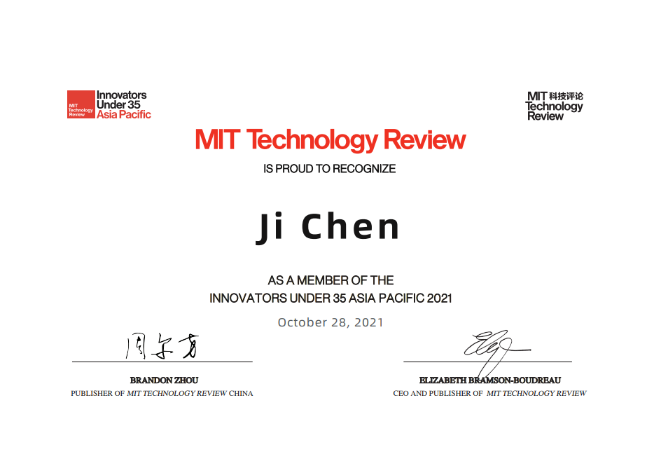 2021年10月28日,《麻省理工科技评论》年度“35岁以下科技创新35人”(MIT Technology Review Innovators Under 35)亚太地区榜单在杭州未来科技城揭晓。北京大学物理学院凝聚态物理与材料物理研究所、人工微结构和介观物理国家重点实验室陈基助理教授与来自14个国家和地区的34名青年科技工作者入选亚太区榜单。