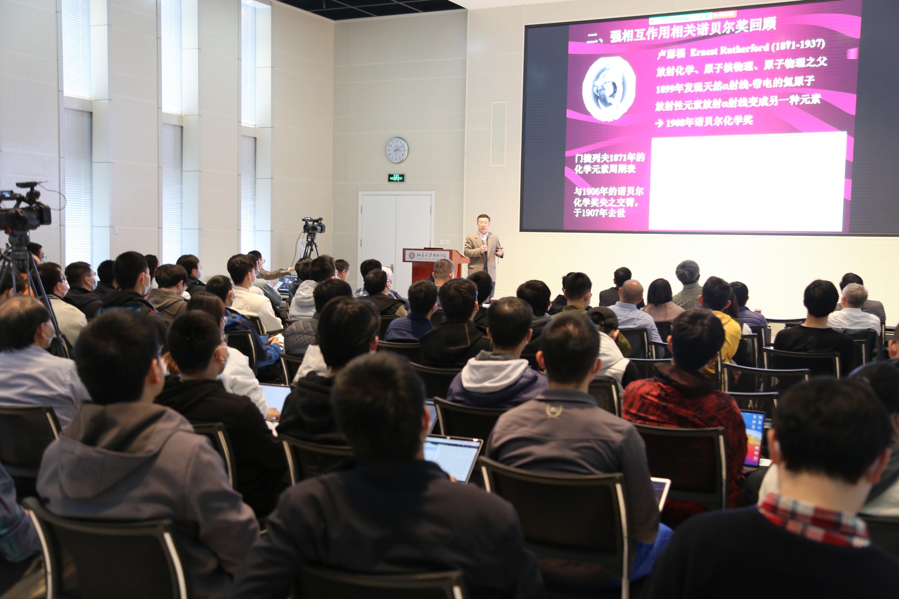 邹冰松院士围绕强相互作用的过去、现在、未来这一主线,首先概述了百余年来人们对物质相互作用的认识历程,指出强相互作用决定了强子、原子核两个物质微观基本层次的结构,也是基本粒子、宇宙天体演化物理的重要组成部分。然后,从欧内斯特·卢瑟福(Ernest Rutherford)对原子核物理的贡献展开,通过介绍十几位诺贝尔物理学奖获得者拓展和加深认识强相互作用的历程,深入浅出地讲述了强相互作用研究发展过程中里程碑式的工作。最后,阐述了强相互作用的强子结构、核素图、量子色动力学(QCD)的相结构等三个基础研究前沿领域的研究概况,展望了强相互作用在核天体物理、标准模型在核物理中的检验、核技术等交叉领域的应用前景。邹冰松院士着重描述了北京正负电子对撞机重大改造工程(BEPCII)、强流重离子加速器装置(HIAF)等国家重大科技基础设施的建设与发展,指出理论研究和实验研究的紧密结合促使我国在强相互作用物理领域占据重要一席之地;他勉励青年师生积极把握时机,潜心研究,勇于挑战未解之谜,力争做出原创性、突破性的工作。