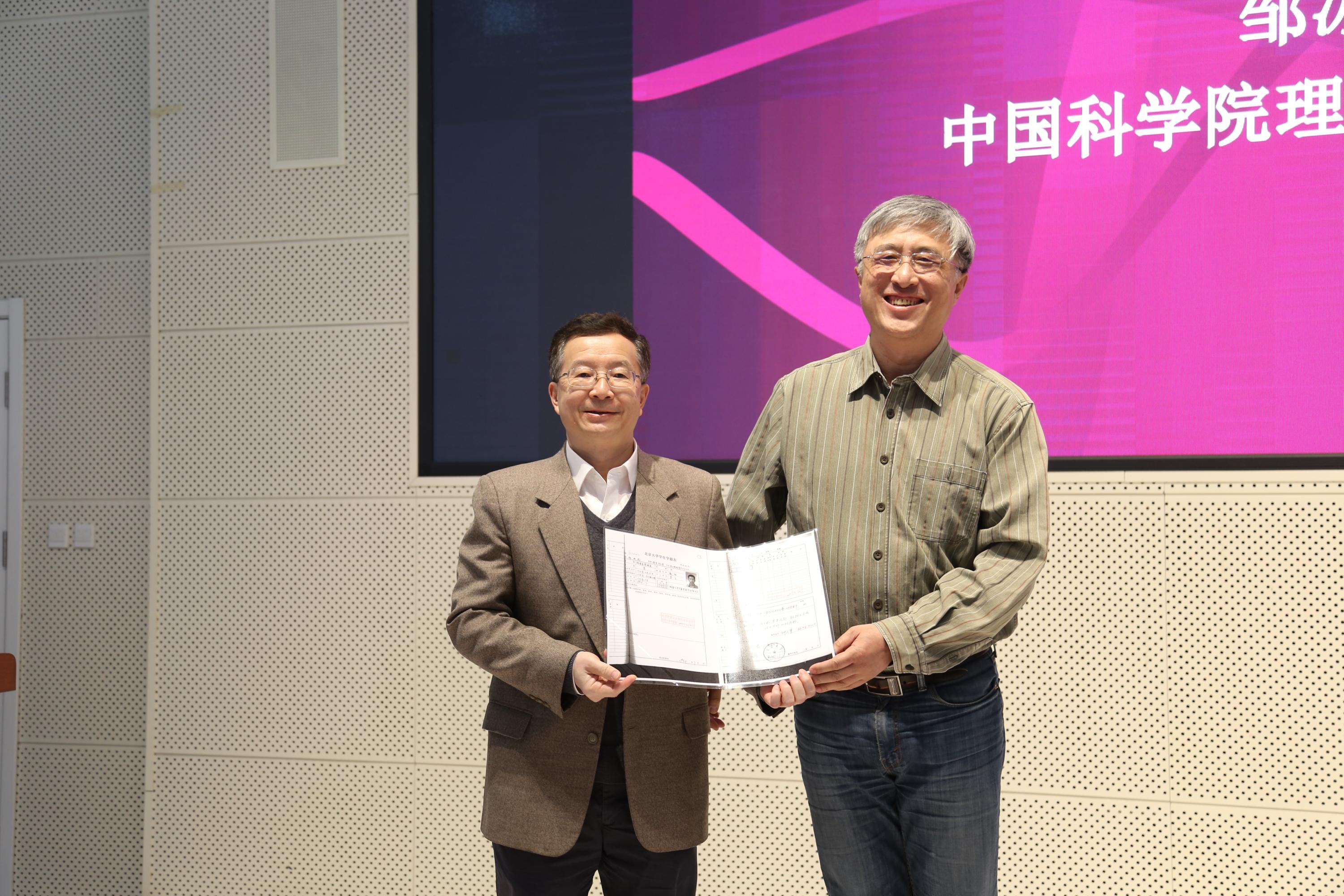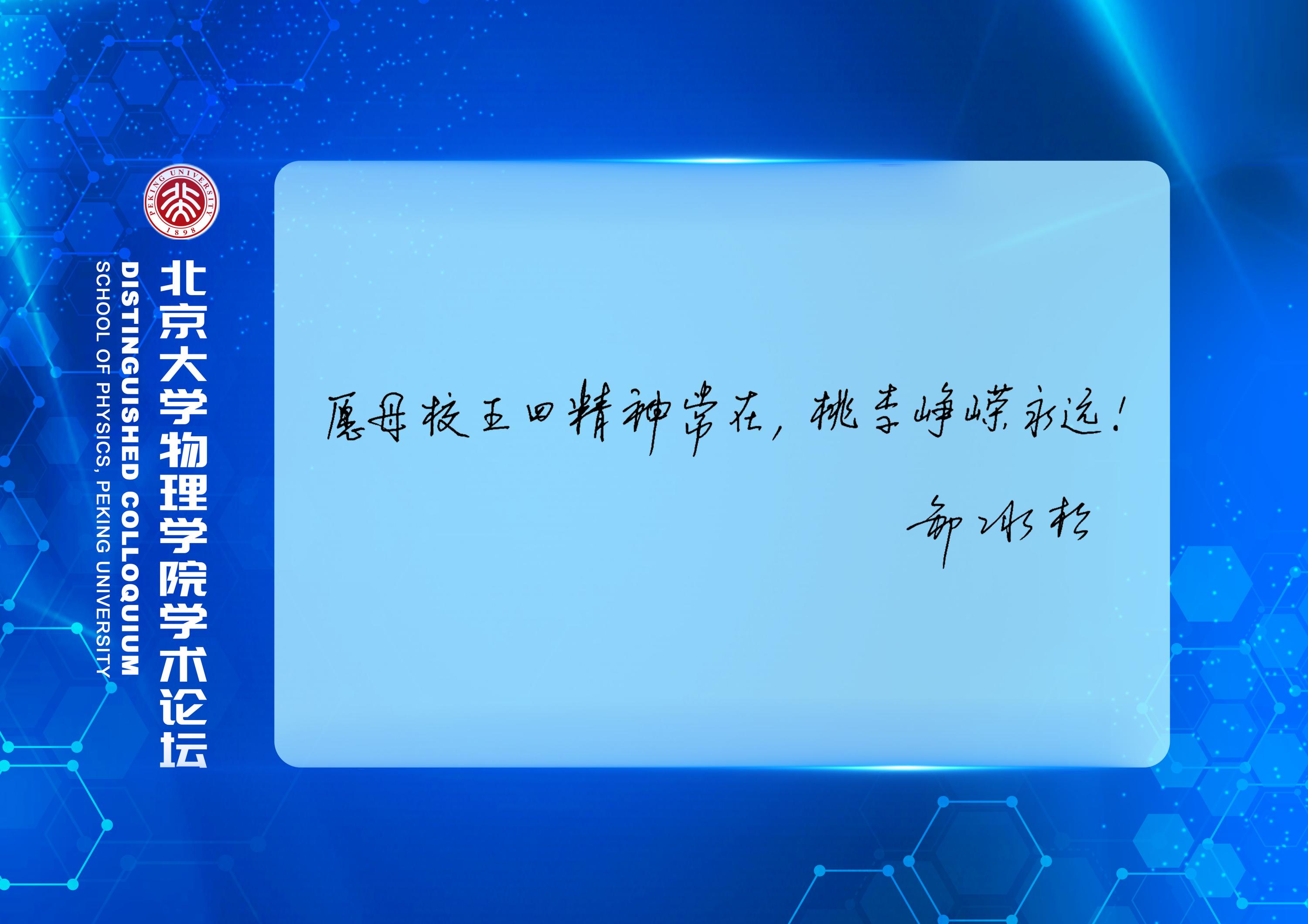 北京大学物理学院院长、核物理与核技术国家重点实验室主任高原宁院士对邹冰松院士重返母校表示热忱的欢迎,赠予他在北京大学技术物理系学习时的学籍表复印件,并衷心感谢他对物理学院学科建设、院系发展的长期关注和对青年教师成长的悉心指导。作为曾经的北大学子和永远的北大物理人,邹冰松院士向物理学院师生表达衷心的感谢和祝愿,并欣然题写寄语。