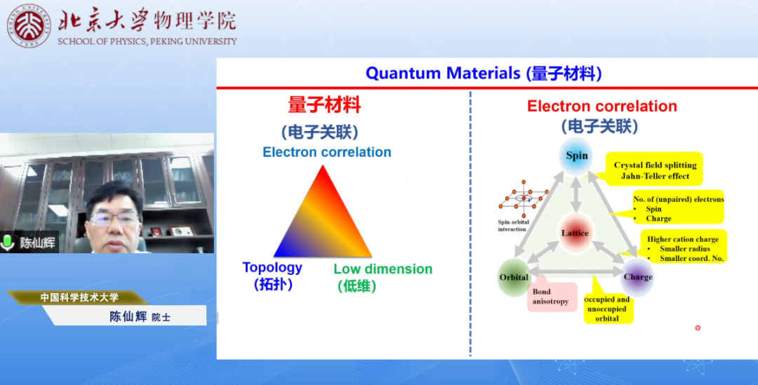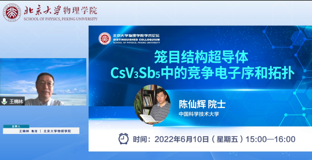 2022年6月10日,北京大学物理学院学术论坛(第十六讲)成功举行。中国科学院强耦合量子材料物理重点实验室主任、中国科学技术大学陈仙辉院士应邀做了题为“笼目结构超导体 CsV3Sb5中的竞争电子序和拓扑”(Competing Electronic orders and topology in a kagome superconductor CsV3Sb5)的学术报告。本次论坛由北京大学物理学院量子材料科学中心主任王楠林教授主持。通过北京大学视频号、B站、抖音和蔻享学术平台观看直播的观众逾19万人次。