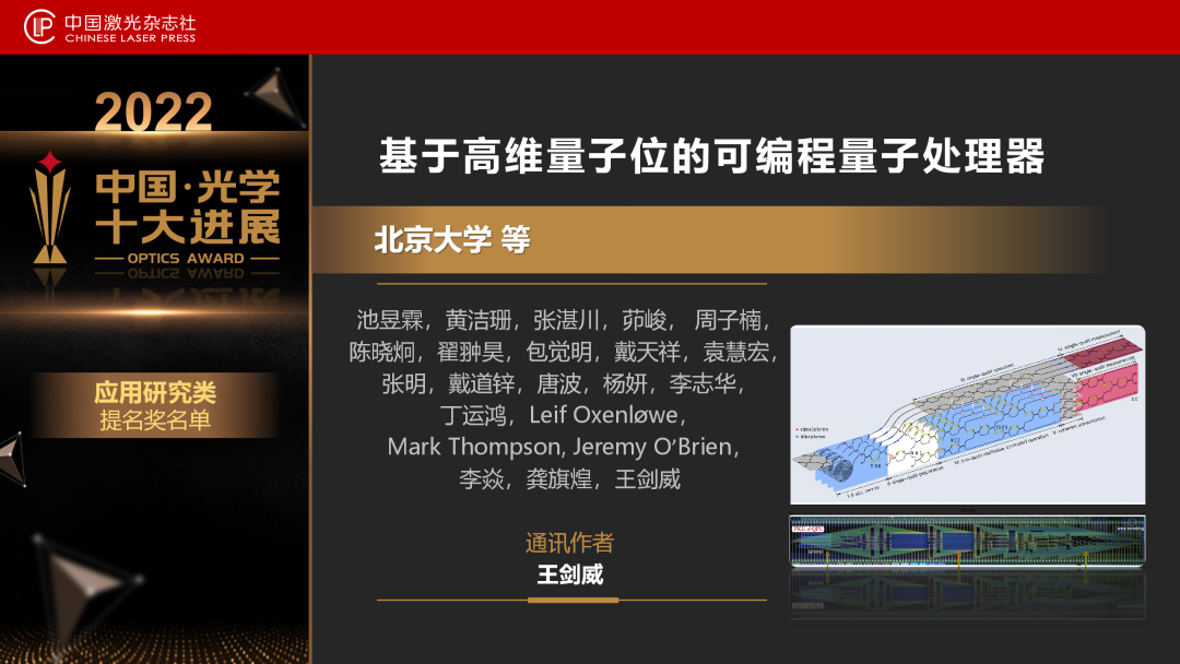 北京大学物理学院现代光学研究所、人工微结构和介观物理国家重点实验室、纳光电子前沿科学中心王剑威团队与合作者实现了一款基于大规模硅基集成光量子芯片的可编程高维量子处理器,实现了高维单量子位和双量子位的初始化、操作和测量,提供了一种自上而下、从算法到量子门操作、从顶层需求到底层物理实现的高维量子计算架构,通过编程重构该处理器超过百万次以上,实现了一系列高保真量子逻辑门操作,执行了多种重要的高维量子傅立叶变换类算法,实现了高维量子计算的原理性验证。