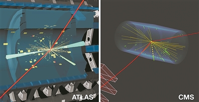ATLAS(左图)和CMS(右图)携手探测到的希格斯玻色子衰变为Z玻色子和光子的候选事件,其中Z玻色子衰变成一对缪子。
