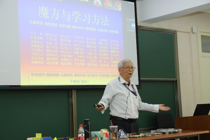 活动第一讲,由北京大学物理系60级、66届校友,中国科学院微电子研究所陈宝钦教授带来主题为“微电子如何把沙子炼造成芯片——以魔方为例谈谈学习方法问题”的科普讲座。年过八旬的陈宝钦教授以热情洋溢的精神状态,深入浅出地讲述了如何做人做事做学问、微电子科技的播种机、亲历光刻技术六十年、沙子如何炼造成芯片、魔方是科学学习教具等。并结合自己的人生经历,分享了自己的人生感悟。最后,现场进行了魔方还原教学演示。现场的校友和小朋友们都被陈宝钦教授的激情所感染。当天下午,陈宝钦教授继续在教室进行魔方教学。在场的小朋友们都收获匪浅、意犹未尽。