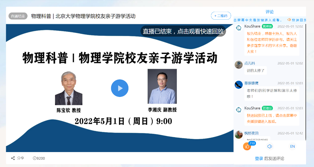 2022年5月1日,正值北京大学124周年校庆来临之际,北京大学校友会物理学院分会在物理学院中楼212教室举行校友亲子活动。本次活动通过内涵深刻的科普讲座、丰富奇妙的物理实验演示,让校友和小朋友们感受物理的神奇之处,感受老一辈物理人热爱科学、踏实勤奋的风采。现场共有十余组校友家庭参加活动,同时在线观看直播的观众逾9000人次。