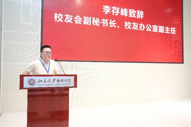 北京大学校友会副秘书长、北京大学校友办公室副主任李存峰代表北京大学校友会致辞。他首先代表北大校友办公室对本次会议的召开致以热烈的祝贺,对物理学院的校友工作给予了充分肯定,并感谢校友为学院、为母校作出的卓越贡献。接着,他强调了“以思想引领时代,以学术报效国家,以实干造福人民”的校友工作核心思想,表示学校校友会会一如既往地支持学院的校友工作开展。