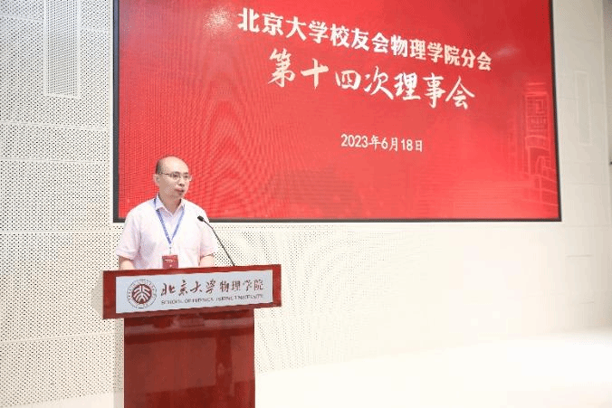 物耘百十传薪火,理行致远照征程。2023年6月18日,北京大学校友会物理学院分会第十四次理事会会议在物理学院思源多功能厅隆重举行。来自物理学院各年级的校友理事通过线上线下相结合的方式“齐聚一堂”,共同为物理学院的建设和校友工作的开展建言献策。北京大学校友会物理学院分会会长、物理学院院长高原宁,北京大学校友会副秘书长、北京大学校友办公室副主任李存峰,物理学院副院长颜学庆出席了本次会议。会议由北京大学校友会物理学院分会秘书长、物理学院党委副书记穆良柱主持。
