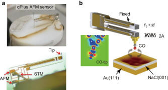 | 图1:(a) qPlus型原子力传感器的实验装置图;(b) 具有电四极矩电荷分布的一氧化碳针尖与强极性水分子之间的高阶静电力。 |