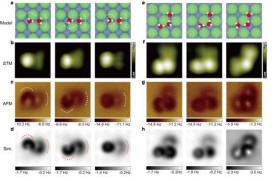 在此基础上,江颖等进一步利用一氧化碳分子对针尖进行化学修饰,调控针尖的电荷分布,通过探测电四极矩针尖与强极性水分子之间的微弱高阶静电力,获得了弱键合的水分子团簇甚至亚稳结构的亚分子级分辨成像,并在原子尺度上确定了其氢键构型和氢原子的位置(图2)。王恩哥、Pavel