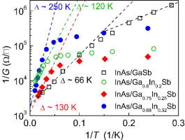 | 图1 通过变温测量拟合得到的InAs/GaSb及InAs/GaInSb量子阱中量子自旋霍尔态的体态能隙Δ。可见随着量子阱中的应力增加(即GaInSb中In组分的增加),Δ值逐渐增大。 |