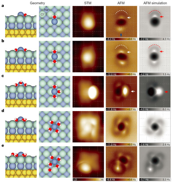 钠离子水合物的原子级分辨成像。从左至右,依次为五种离子水合物的原子结构图、扫描隧道显微镜图、原子力显微镜图和原子力成像模拟图。图像尺寸:1.5